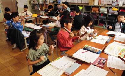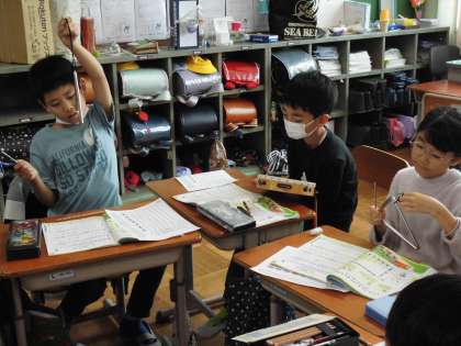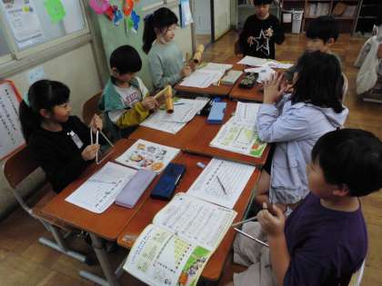 1組でも「かぼちゃ」の学習をしました。いろいろな楽器を使って7人で順番に音を重ねて、音の重なりの楽しさを感じることができました。打楽器の使い方にも慣れてきて、「次は音楽室でしてみたい」とやる気いっぱいでした。