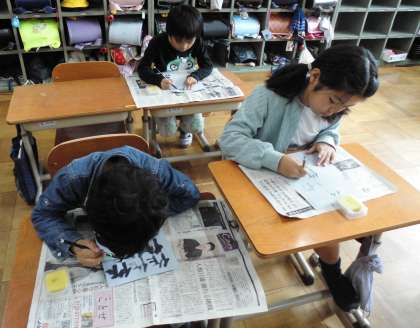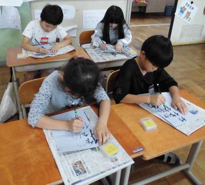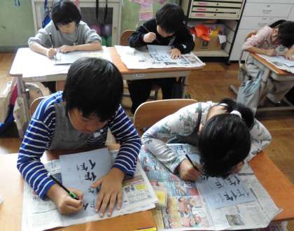 2組でも、水筆を使って「画のつき方」の学習をしました。