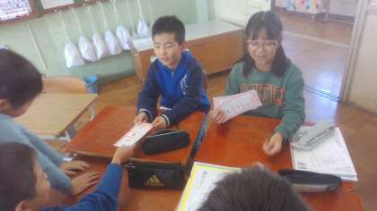 など、注文をしたり、値段を聞いたりする言い方に慣れ親しみ、楽しく会話をしていました。