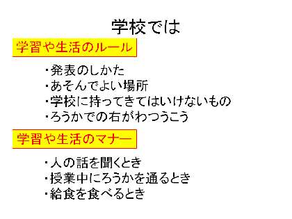 周りの人がいやな気持ちになることは,してはいけない。「マナー」とは,周りの人の気持ちを考えて守る事柄。みんなが気持ちよく生活するには,一人一人が,迷惑にならないよう周りの人の気持ちを考えて行動することが大切です。