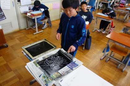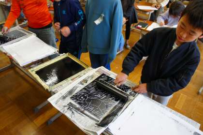 こちらのクラスでも、丁寧に彫った後、順番に刷り始めています。