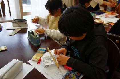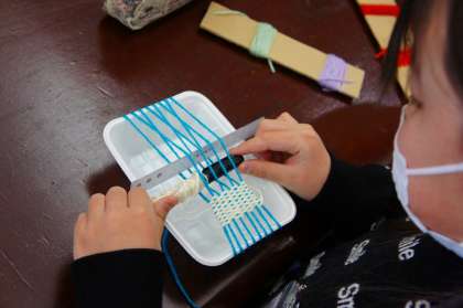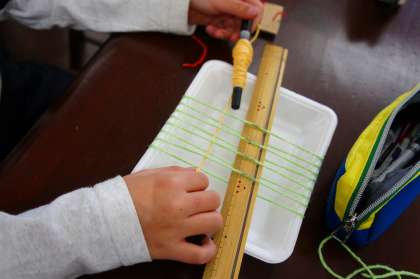 次に、縦糸にしるしをつけ、ものさしを使って糸と糸との間を縫うように織っていきます。慣れるまではゆっくり考えながら、でもすぐに慣れると、スイスイ織ることができました。みなさん、なかなか上手です!