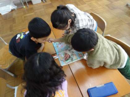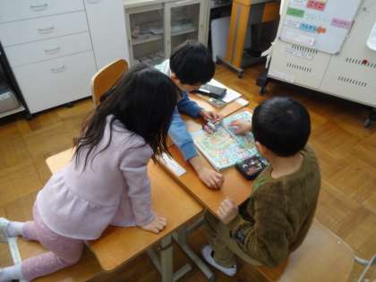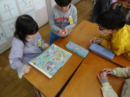 算数科の「大きいかず」の学習で、教科書のおわりにある、「100までのかず すごろく」をしました。教科書を使うたびに、このすごろくのページを見ては、「はやくあそびたい!」と言っていた1年生。今回やっと遊ぶことができ、グループでとても楽しんでいました。1から100までの数がマスになっていて、「10すすむ」などのマスもあり、「66から10すすむから、76だ!」とさっと進める姿も見られました。またやりましょうね!