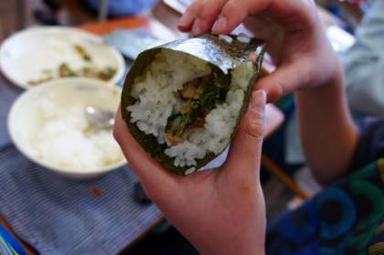 自分でのりの上にご飯をのせ、キンパ風の具を巻いていただきました。ごま油の香りが食欲をそそる、大人気献立でした。「また食べたい〜!」と喜んでいる子がたくさんいましたよ!
