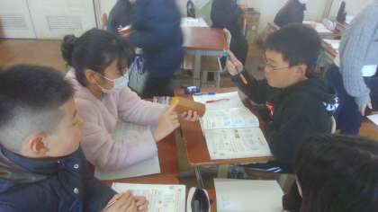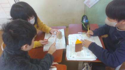 角柱や円柱の底面や側面について調べました。底面の形や、側面、頂点、辺の数をグループで協力しながら調べました。2つの底面は平行で合同になっていることにも気づくことができました。