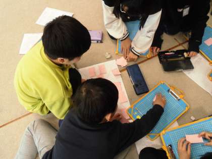他の場所に行った友達や他学年、先生やおうちの人に伝えるために、インタビューしたときのメモをもとに情報を付箋に書き出して整理したり、どれを知らせるか相談したりしました。