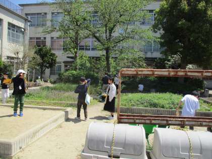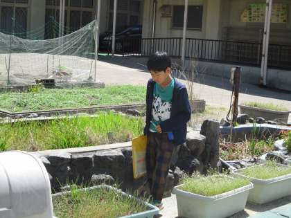 3年生の理科の交流学習では、生き物を探しに行きました。学校の花壇などにいる生き物を探して、プリントに見つけた生き物を書き込んでいました。