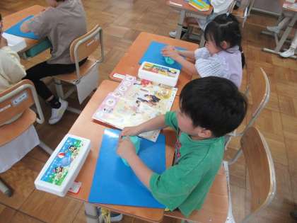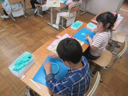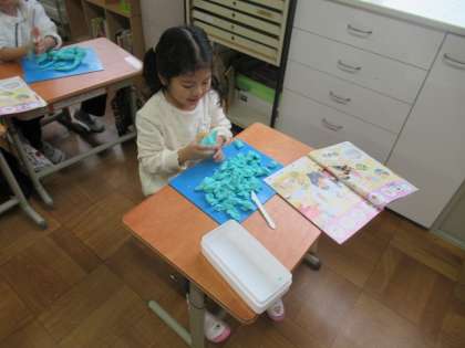 粘土を使って、学習をしました。「○○が好きだから、○○を作ろう」「おいしそうにできた」など、形や大きさを工夫しながら楽しそうに活動していました。