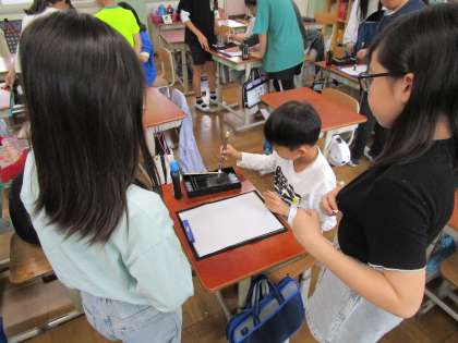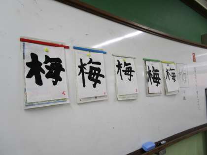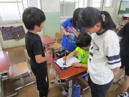 普段は、自分の思うがままに書いている書写ですが、今回は次の人のことを考えて、始筆の位置や字の太さ、長さや間を考えなくてはなりません。良い作品になるよう、みんなで心を一つに、ドキドキと緊張しながら学習をしていました。