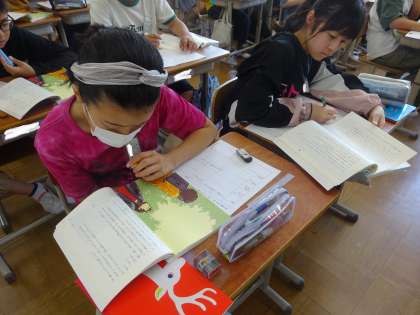 国語科では、「帰り道」の学習をしています。同じ6年生の子どもたちが主人公の作品。視点や作品の構成に着目して読み、「ここ共感する!」「ここいいな!」というところ見つけ、友達とを伝え合うことを最終ゴールとして学習を進めていきます。