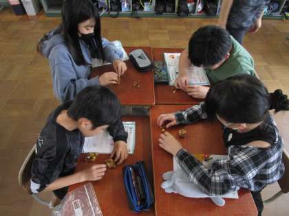 直方体や立方体の体積の求め方を学習しています。1㎤の積み木を使って、直方体や立方体を作り、体積を求めました。体積が16㎤の形を作り班で交流しました。同じ体積で様々な形を表すことができました。