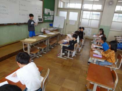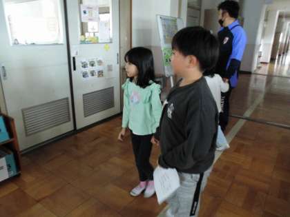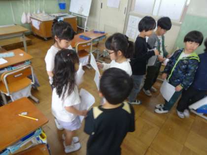 1年生に学校案内をする準備をしています。「案内係」は、学校のいろんなお部屋の場所を確かめました。そして1年生役と2年生役に分かれて、1年生の歩幅に合わせて歩く練習をしました。「説明係」は、お部屋の前でそのお部屋に何があるのか、どんなことをするお部屋なのかなど、1年生に伝わるような説明を考えました。学校案内の日が本当に楽しみな2年生でした。