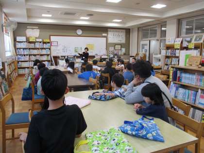 うぐいす学級のみんなで図書室に行きました。2年生と一緒に絵本の読み聞かせを聞きました。新しい読書ノートをもらい、読みたい本を借りました。これから、100冊読書を目指してがんばります。