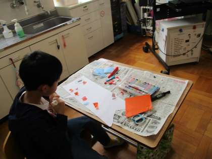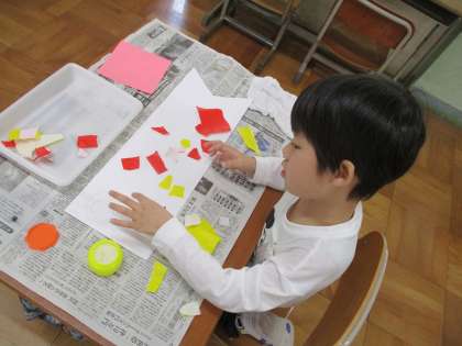 自立の学習でこいのぼりを作りました。好きな色の色紙をちぎったり、はさみで切ったりして、こいのぼりの鱗を作って貼りました。自分だけのこいのぼりができました。