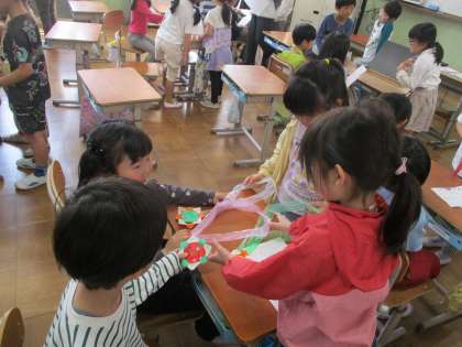 明日の、学校たんけんに向けて、グループの顔合せをしました。学校を案内してくれる2年生に名刺を渡して、自己紹介をしました。好きな食べ物を伝え合って、交流もしました。最後にあさがおのたねが入った手作りのメダルをもらいました。にっこにこになりました。