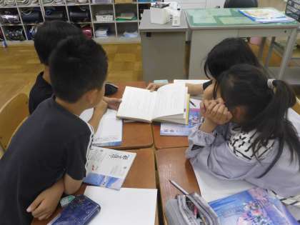 4年生では、「白いぼうし」の学習を終えました。最後に、あまんきみこさんの作品で、松井さんが中心人物」の本を並行読書し、感想を伝えあいました。「白いぼうし」と同じように、不思議なことが起きたりお、動物がばけていたりすることが分かりました。児童の中には、「表現の中で、たくさんの色やにおいがうまく使われている」ことに気づく児童もいて、あまんきみこさんの素敵な世界観にどっぷり浸っている様子でした。