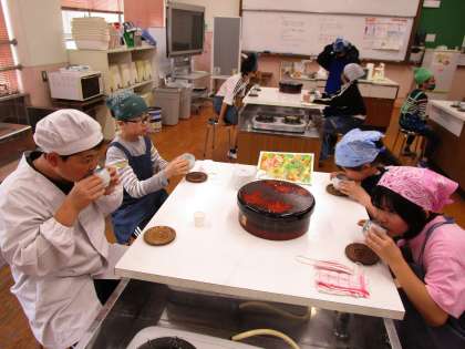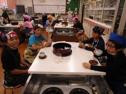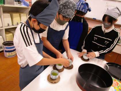家庭科の授業で、初めて家庭科室を使いました。ガスコンロの使い方とお茶のいれ方を学びました。お茶をいただいて「まろやかで美味しかった。」「少し苦かった。」と様々な感想がありました。これからも家庭科室で調理実習をしたり裁縫をしたりするのが楽しみですね。