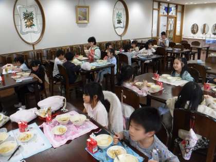 学習の後には、ランチルームの大きなテーブルで友達と一緒に楽しそうに給食を食べていました。