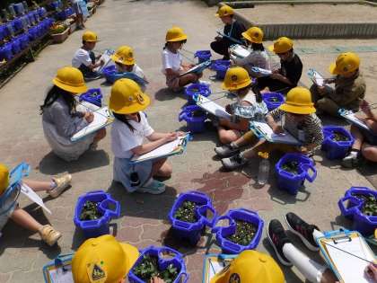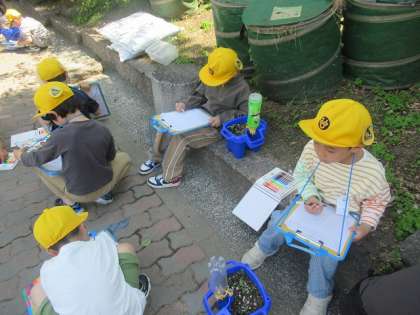 「赤紫色をしているところがあるね」「葉がハートみたいな形をしている」など、いろいろなことに気が付いていました。