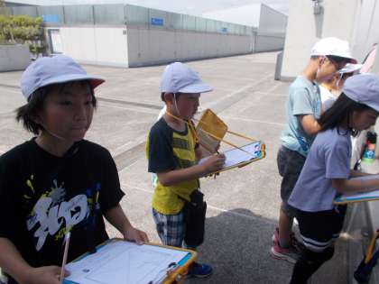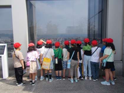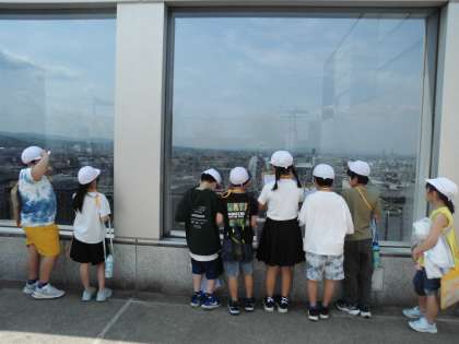 それぞれの方角を確認しながら「梅小路公園は西の方にあるね。」「南の方には山がないよ。」などと、友達と一緒に話し合いながら学習することができました。高いところから見ることで、建物の大きさや集まり方、道の大きさなども学ぶことができました。