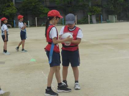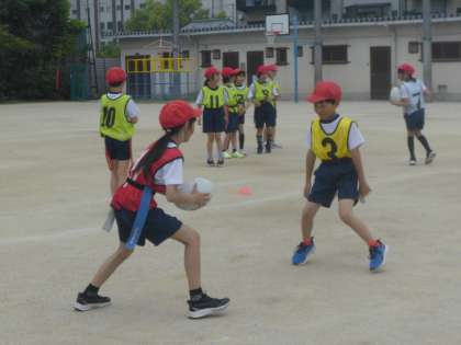 4年生では、体育科「陣取りゲーム」〜タグラグビー〜を始めました。「前にボールを投げられないこと」や「待ち伏せ禁止(オフサイド)」など、難しいルールが多いですが、楽しく助け合ってがんばってきます。
