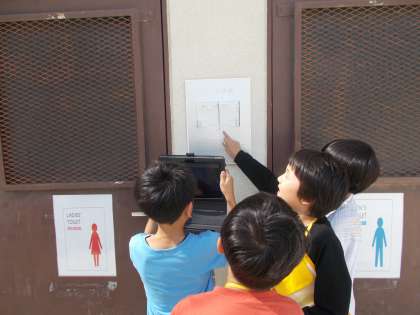 梅小路小学校は、お年寄りの方や赤ちゃんを連れている方、目や体が不自由な方など、すべての人にとって快適な場所なのかを調べました。グループで協力して調べ学習を進め、梅小路小学校に「点字」や「車いす用のトイレ」があることに気付くことができました。また、段差が多い所など、お年寄りや体が不自由な方にとっては過ごしづらい場所も発見することができました。