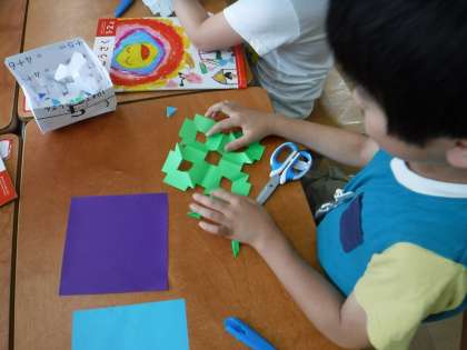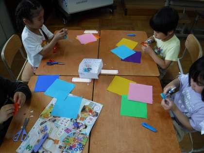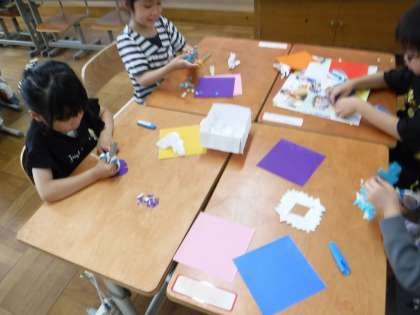 今日の図画工作科の学習では、はさみの安全な使い方を確認しながら、折り紙でかざりをつくりました。紙を折りたたんでから切ると、いろんな模様ができることをいかして、どの子も思い思いの自分だけのかざりを作っていました。
