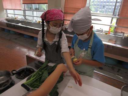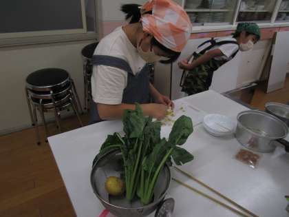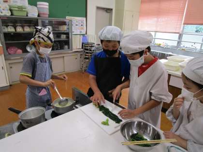 昨日の2組に続き、今日は1組が調理実習をしました。ほうれん草とじゃがいもを調理するのですが、お鍋の中が水の時に入れる野菜と、沸騰してから入れる野菜の違いを事前に学習して本番に挑みました。みんなで考えながら、そして協力しながら、活動をすることができました。