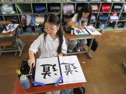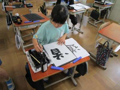 今回の書写は「道」と書きました。どっしりとした「道」、一画一画を丁寧に書いた「道」、力強い「道」…。まるで、その児童がこれから進む「道」を表しているようで、とても素敵な作品に仕上がりました。