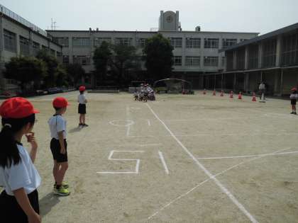 1時間目にソフトボール投げをしました。「いち・に・さん」のリズムで踏み出すことや、腕を上に伸ばすことを意識してボールを投げました。