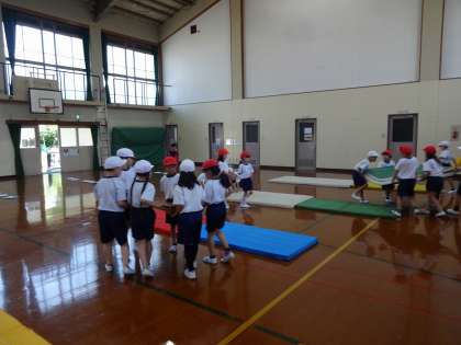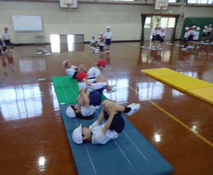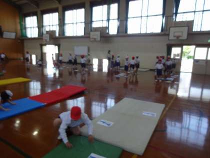 体育科で「マットあそび」の学習を始めています。1年生の時と同じように2年生みんなで学習しています。まずグループで力を合わせて、準備をします。ゆっくり安全に運ぶのも上手になってきました。グループごとに体ならしの「くま歩き」や「ゆりかご」などをしてから、ねらい1の「いろいろな場で、自分ができるマットを使った遊びに挑戦しよう」に取り組んでいます。だるまころがりで、前よりも何度も転がれたり、後ろまわりが、マットに沿ってまっすぐに転がれるようになったり、できることが増えています。これからも学習を続けていきます。