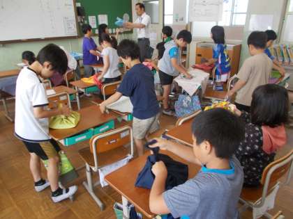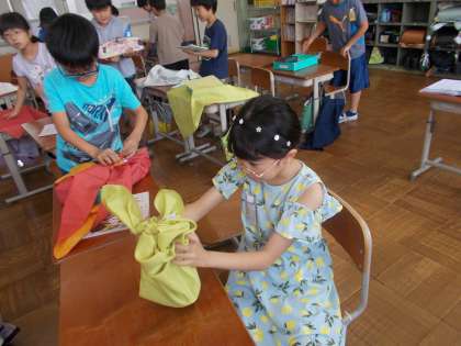 子どもたちは、教科書や筆箱、水筒などを包んでみて「いつもより大事な物に感じる。」「綺麗に落とさないように包めるのがすごい。」と話しながら、日本文化のよさを実感していました。