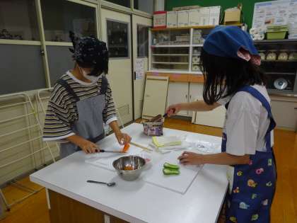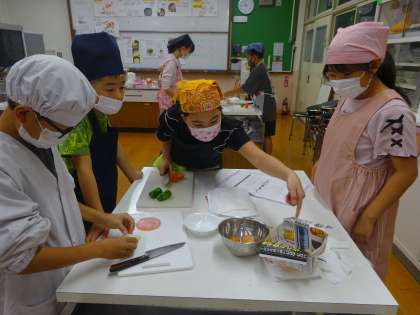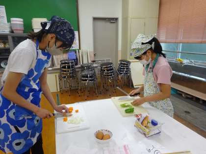 家庭科の「朝食から健康な一日の生活を」の学習では、炒める調理(いろどり炒め、スクランブルエッグ、青菜炒め)の実習を行いました。野菜の切り方、火加減などに気をつけながら協力して実習を行うことができました。