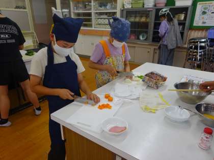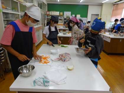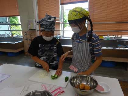 家庭科の「朝食から健康な一日の生活を」の学習では、炒める調理(いろどり炒め、スクランブルエッグ、青菜炒め)の実習を行いました。野菜の切り方、火加減などに気をつけながら協力して実習を行うことができました。