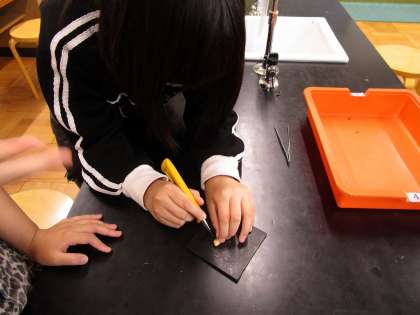 インゲンマメの種子にはでんぷんが含まれているかをヨウ素液で調べました。でんぷんにうすめたヨウ素液をつけると、こい青紫色になることが分かりました。また薬品を使うときには、保護眼鏡をかけることを知りました。