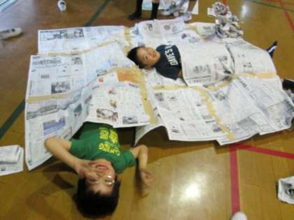 新聞紙を使って,造形遊びをしました。最初は一人一枚ずつ手にとって,丸めたり,のばしたり,しわしわにしたり,おったりして,いろいろと形をかえて楽しみました。