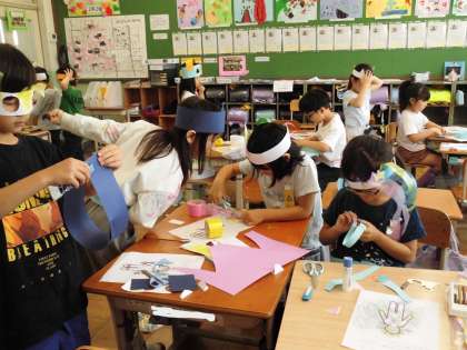 図画工作科「わっかでへんしん」の学習をしました。したいへんしんに合う飾りをわっかにつけて、音楽に合わせて歩いてみました。みんな友だちのへんしんのすてきなところをたくさん見つけていました。とても楽しい学習になりました。