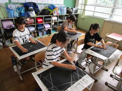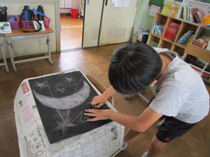コンテの黒で塗りつぶした画用紙に、今日は消しゴムでコンテを消し、絵をかきました。単元名のとおり「消してかく」です。真っ黒になりながらも、とても楽しそうでした。ボワーと暗闇から何かが浮かび上がるような、素敵な作品が出来上がりました。