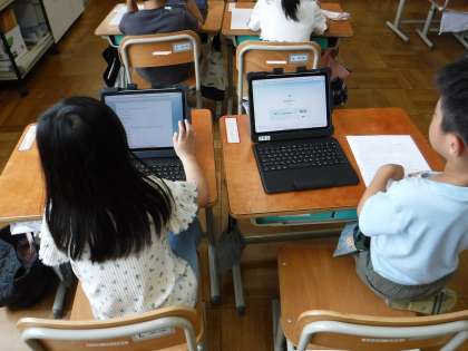 保護者の方にもすぐーるで配信されている「1学期学校評価アンケート」、児童用のアンケートに1年生の子ども達も自分のタブレット端末で回答しました。