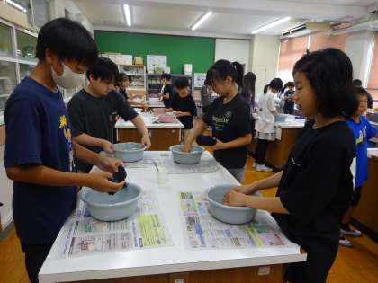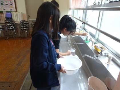 「夏をすずしくさわやかに」の学習では、夏を快適に過ごすための住まい方や衣服の着方、手入れの仕方について学んでいます。今回は、靴下を手洗いする実習をしました。汚れがひどい時は、つまみ洗いをすること、洗剤が残らないようにすすぐことなどを知り、丁寧に、汚れを落とそうと一生懸命靴下を洗う姿が見られました。