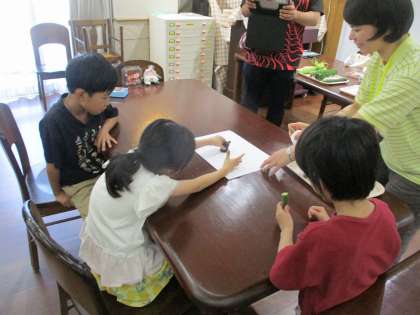 明日は、夏野菜を使った給食だそうです。そこで、明日の給食のもぐもぐ通信のクイズ作りをすることになりました。野菜の切り口にインクをつけてスタンプしたり、野菜の表面に紙を当てて、こすりだしをしたりしました。明日の野菜クイズが楽しみです。