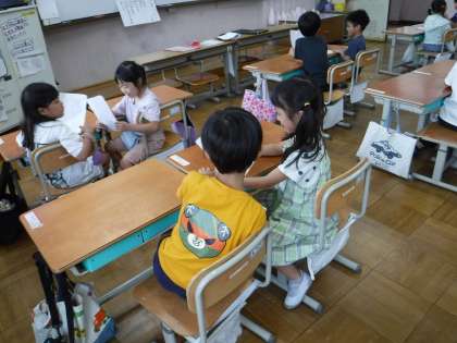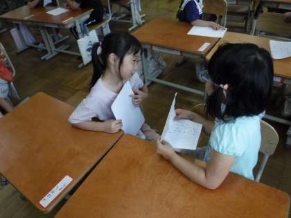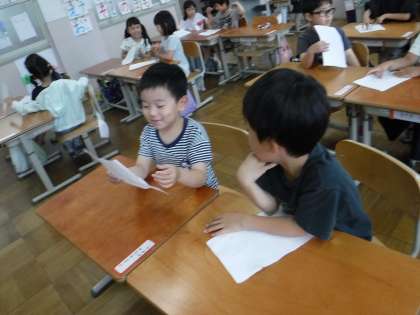 鬼ごっこやピアノ、本など、自分の好きなことと訳を書いた文章を読んで相手に伝え、聞く側はそれに対して相槌をうちながら聞いたり、質問をしたりしました。なかには、鬼ごっこが好きだという友達と話したことで、「明日の休み時間一緒にしよう!」と約束をすることができたペアもありました。