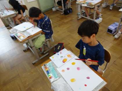 図画工作科の学習で、4色の色を混ぜてじぶんだけのオリジナルの色をつくり、すてきなパレットを描いて作りました。赤、青、黄、白色の絵の具を出し、赤と青で紫、紫と白でうすい紫…といった感じで、組み合わせを変えて、どんどんオリジナルの色を作っていきました。画用紙に色をのせると、きれいに色が見えて、「こんな色になった!」「きれい!」と楽しく取り組んでいました。絵の具を使うのは2回目だったので、前よりもとてもスムーズに準備や後片付けをすることができました。絵の具を持ち帰っているので、お家できれいに洗っておいてくださいね!また次の学習が楽しみですね。