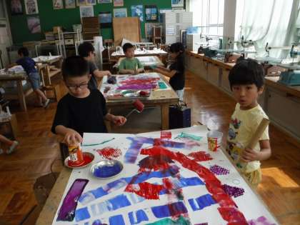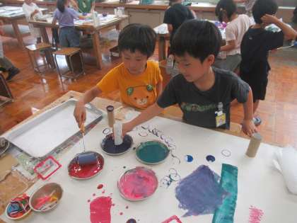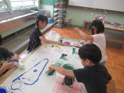 まずは、大きな模造紙でどんな形が写るかグループの友達と一緒に試しました。その後、画用紙に一人ずつ「ぺたぺた」「コロコロ」色んな形や色を写して遊びました。どの子も材料や道具、自分の手を使って、思い切り活動を楽しんでいました。