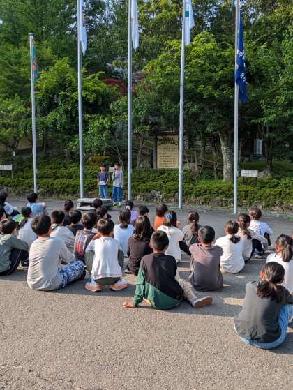 朝のつどいです。みんな元気に今日のプログラムを楽しみにしています!
