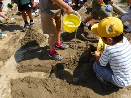 グラウンドの砂場を使って、図画工作科「すなやつちとなかよし」の学習をしました。溝を掘って川、山に穴をあけてトンネル、デザートカップやバケツを使って型抜き、どろ団子に葉っぱやお花を飾る等、砂や水、泥の感触を存分に楽しみながら、みんな思いきり活動していました。