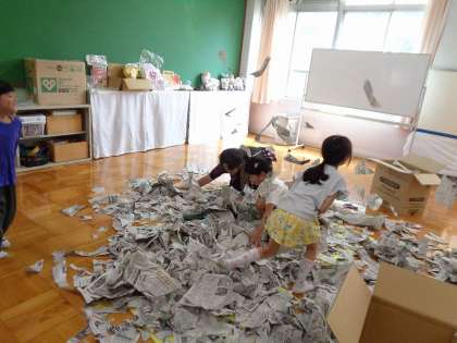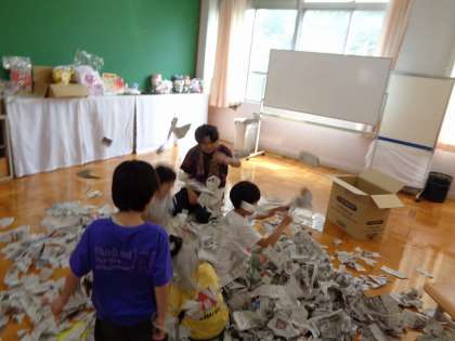 8月は、3年生の誕生日がありました。3年生に、みんなで楽しくできることは何か?と相談すると、「大ピンチ展で見た、牛乳こぼれた大ピンチみたいなのがしたい。」というアイディアを言ってくれました。学校にあるもので、できる方法を考えた結果、新聞を細かく破って、大きな段ボール箱に入れ、それがこぼれて、新聞プールになるというお楽しみをすることになりました。