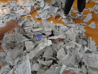 新聞プールができると、みんな大興奮でした。新聞の中を泳いだり、埋もれたり、新聞をまき散らしてかぶったりして、楽しみました。片付けるのが大変でしたが、協力してできました。