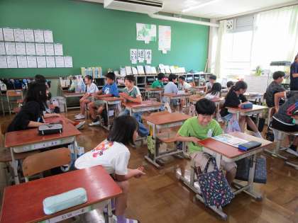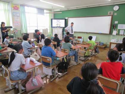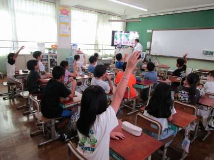 梅小路小学校に新しいALTが来ました。ALTの自己紹介のスライドを見ながら様々なクイズに答えました。ペア活動では「What food do you like?」「What animal do you like?」「What sports do you like?」といった1学期に習った表現を使って友達に質問しました。大盛り上がりの1時間で、教室に英語が響き渡っていました。2学期も楽しく学習していきましょう!