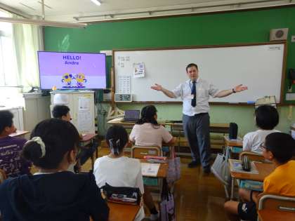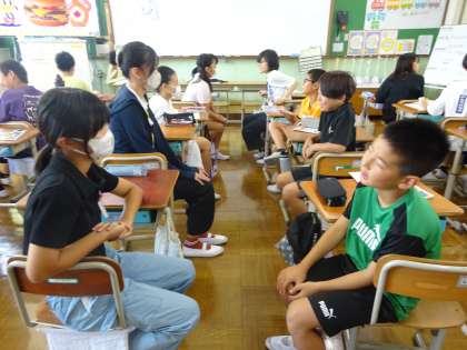 2学期から新しいALTの先生が来ました。今回は、先生の自己紹介を聞いたり、簡単な質問をし合ったりしました。これからの外国語の学習が楽しみです。